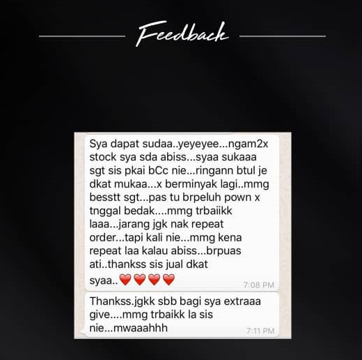 Kebanyakkan pelanggan yang dah guna BC GLOW mereka pakai 2 hingga 3 bulan. Malahan ada yang lebih daripada itu.